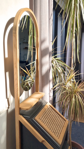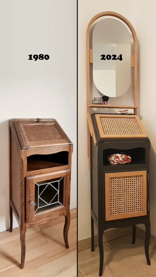 Modernisation d’un meuble de famille pour qu’il trouve sa place dans un intérieur contemporain. Ainsi, cet ancien meuble de téléphone des années 80 s’est transformé en une coiffeuse élancée, avec des courbes et du cannage pour coller aux tendances actuelles. Une démarche durable, respectueuse du travail réalisé par mes prédécesseurs, qui réduit notre impact sur l’environnement.