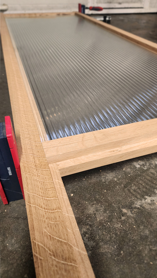 Chêne massif qui a poussé à Charmes dans les Vosges (cadre, les parties cintrées et le panneau en partie basse), verre « flûte » pour la partie haute. Verni mat incolore sur l’ensemble de l’ouvrage.