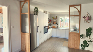 Fabrication de 2 verrières symétriques style art déco, pour redéfinir les contours de cette cuisine ouverte sur la salle à manger. Les parties vitrées laissent passer la lumière tout en dissimulant la cuisine aux convives.